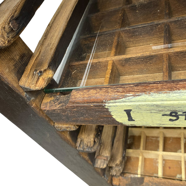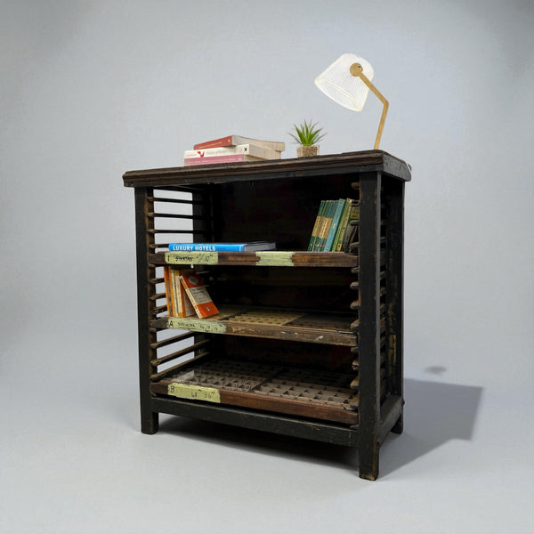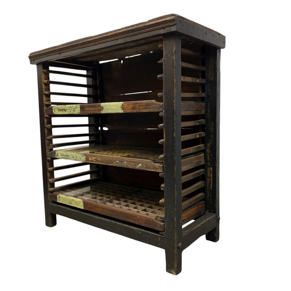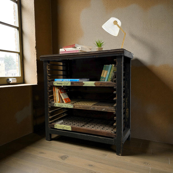 A superb antique stained pine print rack with three print trays. The three print trays have been refurbished with a new glass & have created very functional shelves for books or other collectables, even kitchen crockery. The glass can also be lifted so small ornaments can be arranged in the print tray compartments. The sides of the rack are of a ladder design & the print trays have original text which gives it history & personality. A very interesting & attractive alternative to a standard bookcase.
