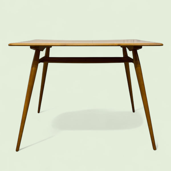 A simply stunning & seemingly rare midcentury 393 Ercol breakfast table with a useful under rack. The Ercol dining table is a perfect size as a four person dining or breakfast table beautifully constructed from beech & elm. The dining table legs are tapered & the underneath rack is perfect for magazines or the morning paper! The dining table is in great condition. See our listings for complimentary Ercol furniture.