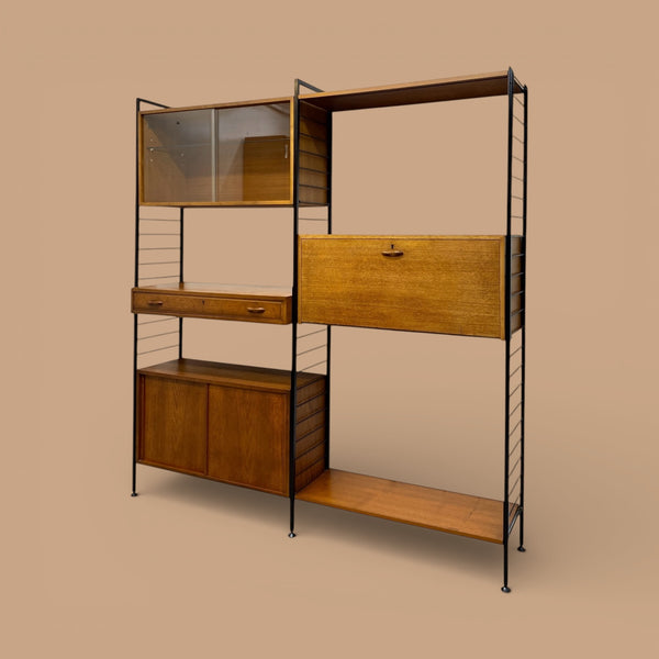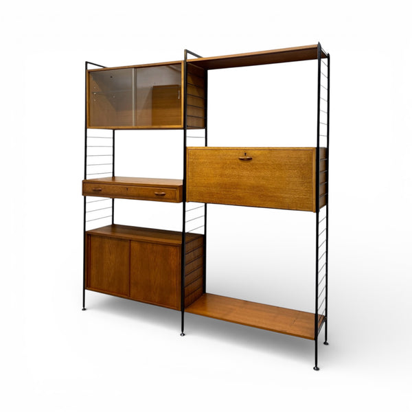 A fabulous midcentury Staples ladderax wall system designed by Robert Heal. The two-bay system with black metal uprights & teak wood shelves & cabinets is a modular design allowing components to be rearranged to suit different needs. The system has three teak shelves, a glass fronted cabinet, a single drawer desk, a bottom double cupboard & a cocktail drinks cabinet. A super amount of storage, very stylish & in good vintage condition.