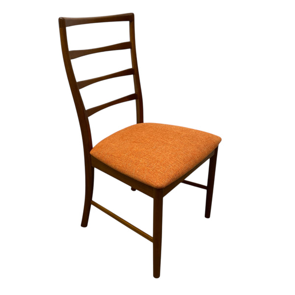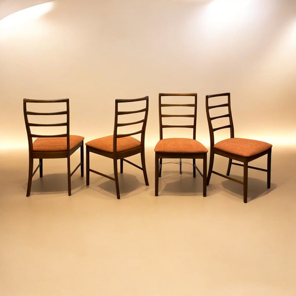 A set of four midcentury dining chairs by McIntosh circa 1960s. The teak dining chairs are very elegant with their slender legs & slightly curved ladder backs. The seat pads have been professionally reupholstered in a beautiful Yorkshire Camira fabric. A lovely set in great condition. See our dining tables to compliment.