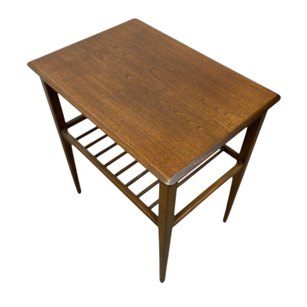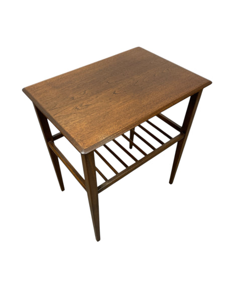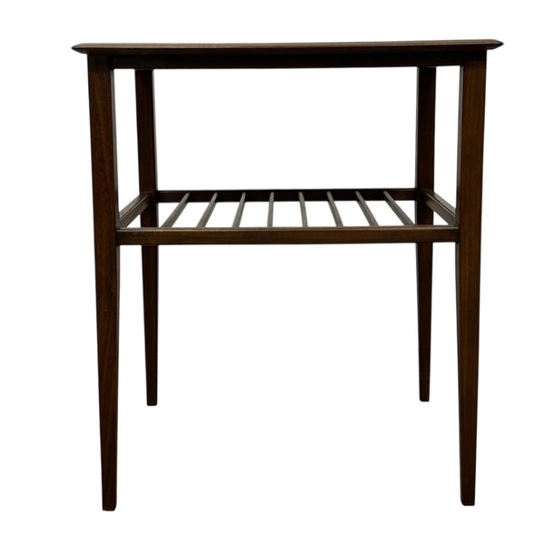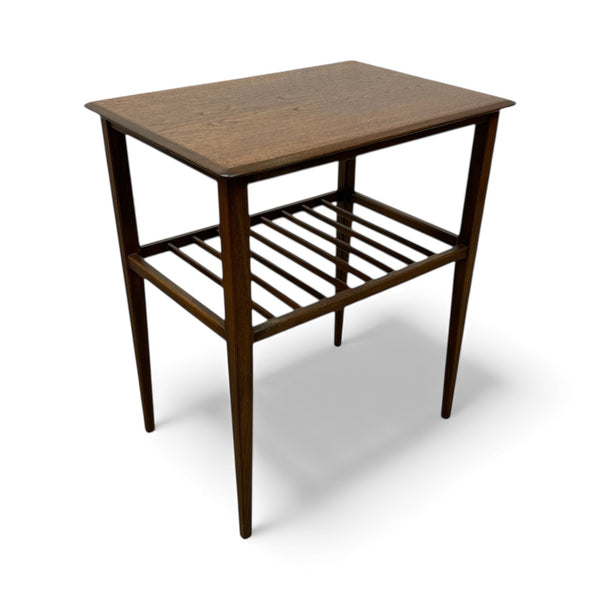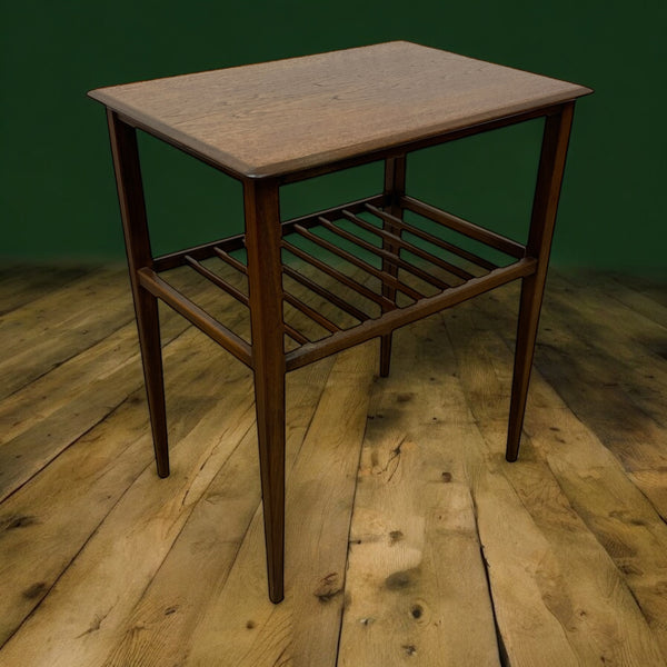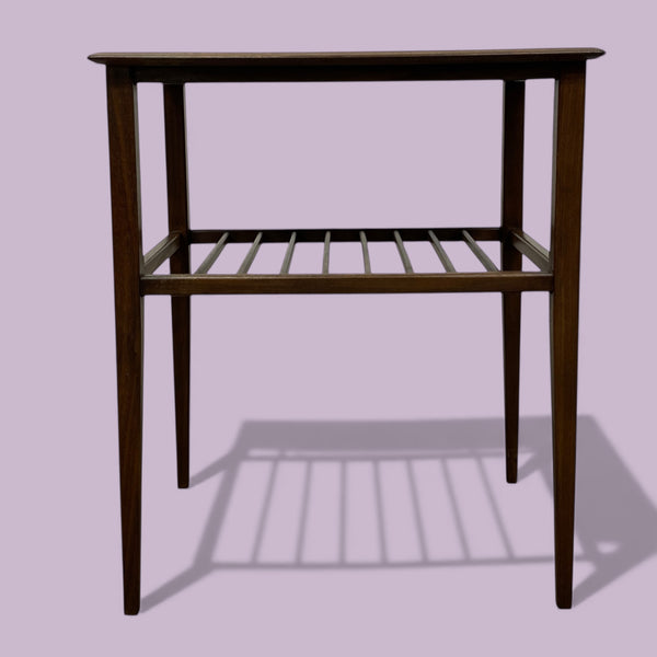 A beautiful side or occasional midcentury table designed by Richard Hornby for the British furniture maker Fyne Ladye of Banbury. The 1960's table is solid afromosia & features a finely crafted bevelled top, long slender tapered legs & a handy lower slatted magazine or book shelf. The piece is in beautiful condition & would make an attractive lamp or plant stand.