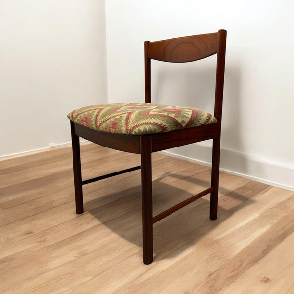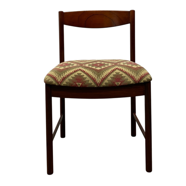 A set of six midcentury dining chairs. The beautiful rosewood is rich in colour with an attractive grain & curved back rest. The seat pads are in a coloured aztec fabric in warm reds, greens & neutrals making them an interesting colour palette for a contemporary or period interior. The chairs are comfortable & in good condition. See listing for the rosewood dining table.