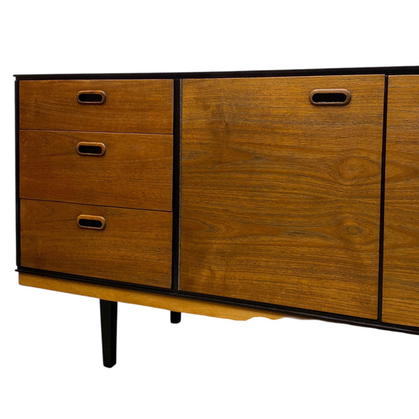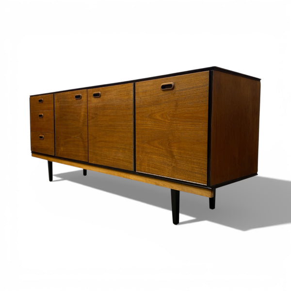 A very stylish midcentury sideboard manufactured by British Avalon. Avalon Furniture, based in Yatton, Somerset, produced popular modern furniture during the 50s. The simple & stylish credenza has tapered ebonized black legs & dark brown edging which contrasts well with the beautiful teak. The sideboard has an abundance of storage having a double cupboard with internal shelf, a drinks cupboard with a drop down door & three drawers, one lined. A fabulous piece for either a contemporary or period home.