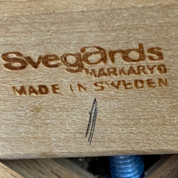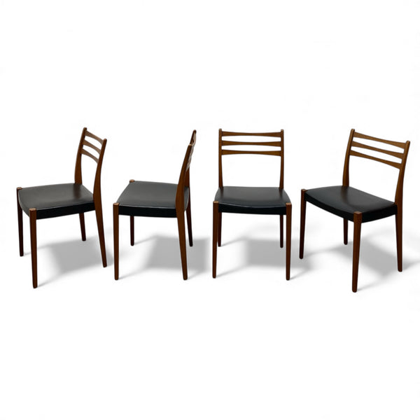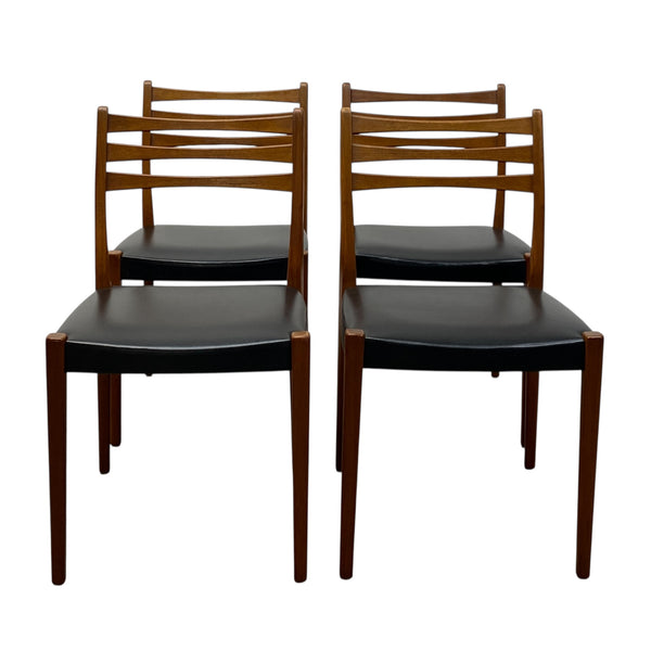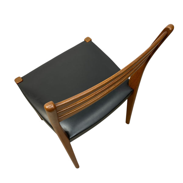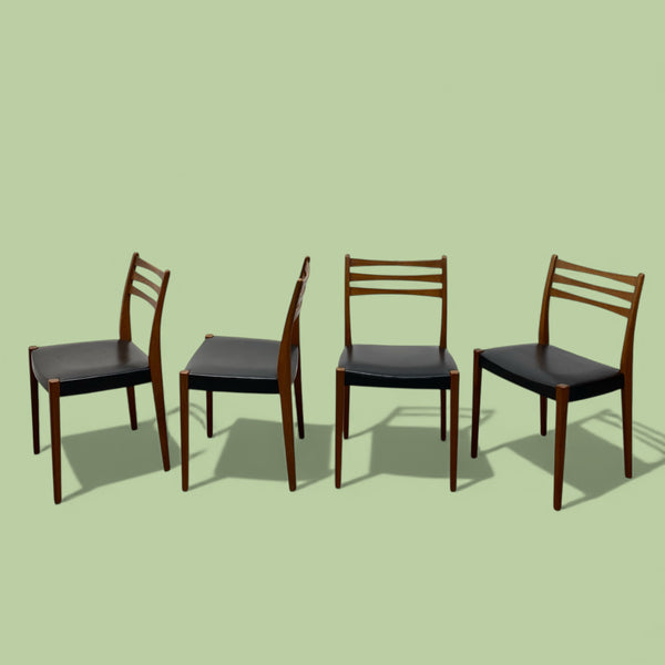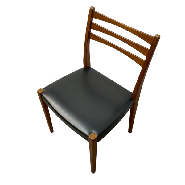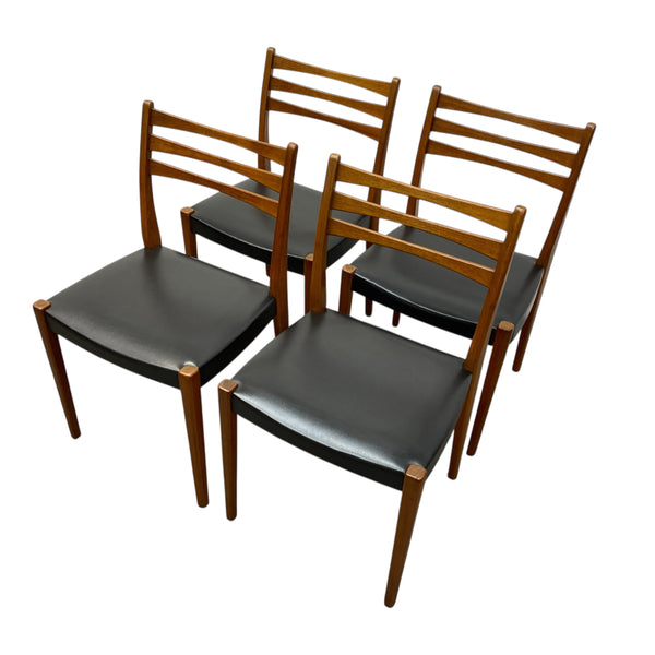 A fabulously stylish set of four midcentury dining chairs. The Swedish chairs manufactured by Svegards Markaryd have a ladder back design & elegant legs in a rich teak. The seats are a black vinyl reminiscent of the midcentury period. The dining chairs are comfortable & in good condition. See our dining tables to compliment.