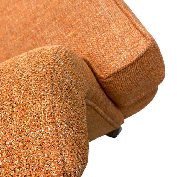 A fabulous midcentury 1960s lounge chair intended as a smaller lady’s version of the G Plan’s Blofeld “Most Comfortable Chair in the World ” The swivel chair is a beautiful shape with its high buttoned back, curved arms & ergonomic lean. The lounge chair sits on a swivel base with castors. The chair has been professionally reupholstered in a burnt orange Yorkshire Camira fabric. A beautiful example of a midcentury design refurbished for modern living.