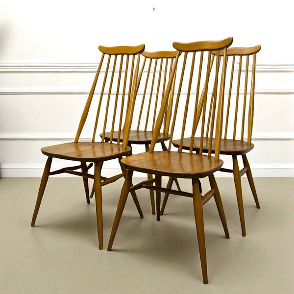Ercol’s vintage Goldsmith chairs are among some of their most popular with an appeal that endures. Tall & elegant with the signature ‘moustache’ tops, The set of four Ercol Goldsmith chairs are constructed with beech legs & English elm seats & expertly crafted as you would expect from Ercol. See our collection of Ercol listings to compliment. The chairts are in beautiful condition.