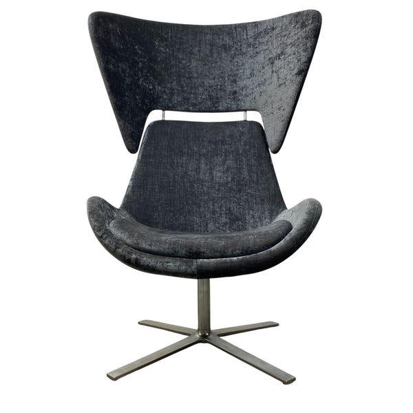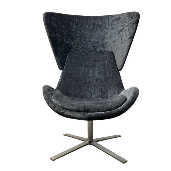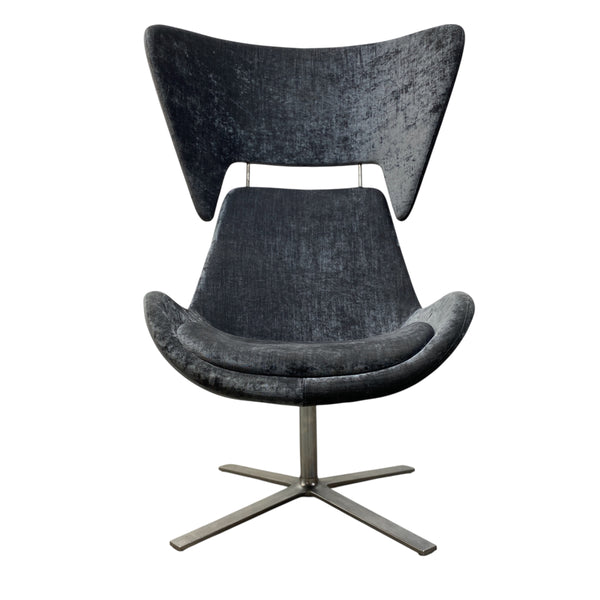 Orange Box Avi is a modern executive meeting chair that has a distinctive aesthetic sculptured approach. Avi has luxuriously integrated a slimline shell upholstered in a grey velvet fabric that offers an upright posture. The high backed cylinder shape is easily removable for a lower backed chair. The chair sits on a steel swivel base & is in good condition.