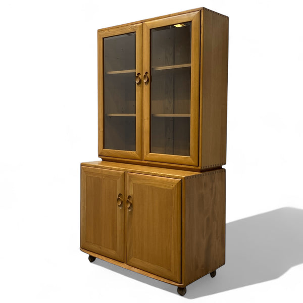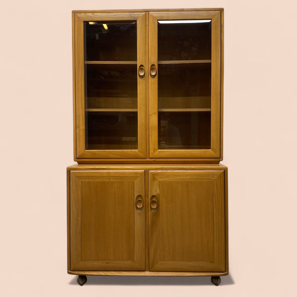 A fabulous vintage Ercol Windsor glazed display cabinet in beech & elm. The bottom half of the display cabinet sits on original castors, has a double cupboard with beautiful Ercol handles. Inside are two shelves & a plate rack or vinyl storage, dependant on your storage requirements. Above the base is a double fronted glass display cabinet with internal shelving & recognisable quality craftsmanship. The Ercol piece is in good vintage condition. See our full Ercol range.