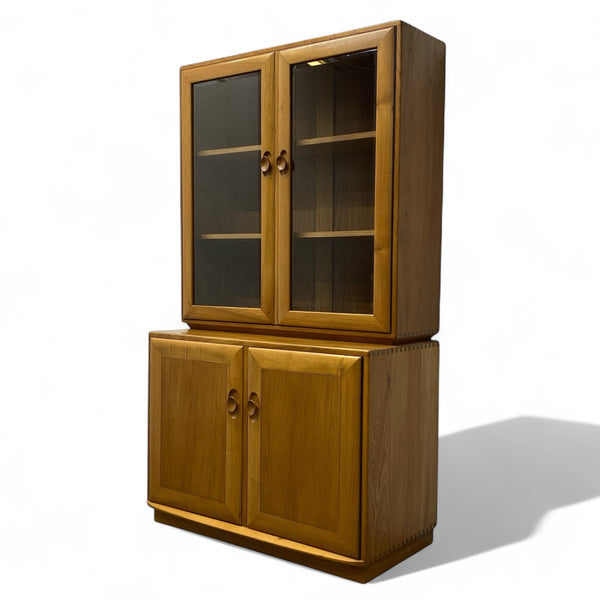 A fabulous vintage Ercol Windsor glazed display cabinet in beech & elm. The bottom half of the display cabinet has a double cupboard with beautiful Ercol handles. Inside are three shelves & a cutlery drawer. Above the base is a double fronted glass display cabinet with internal shelving & recognisable quality craftsmanship. The Ercol piece is in good vintage condition. See our full Ercol range.