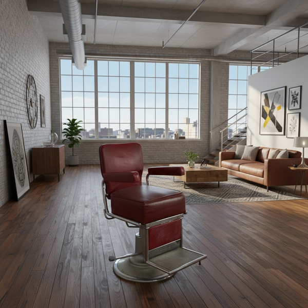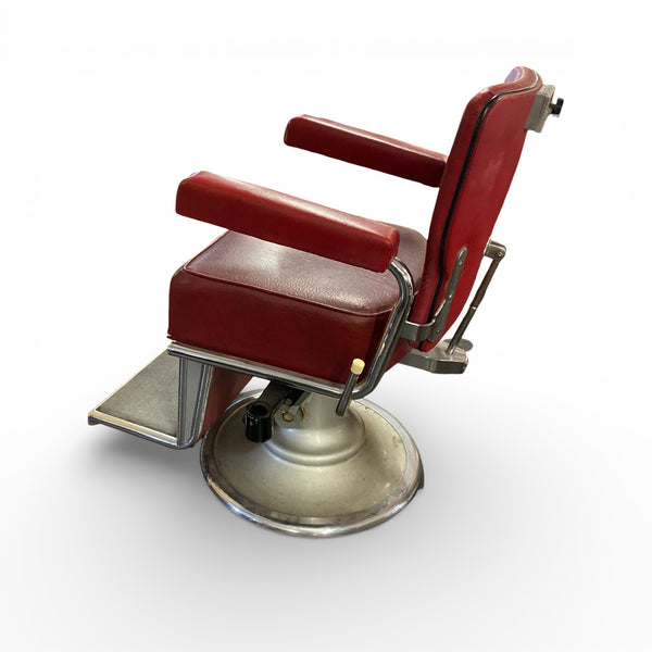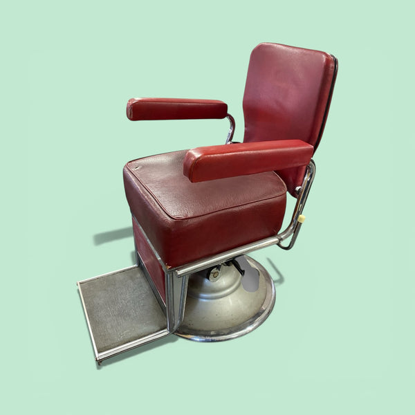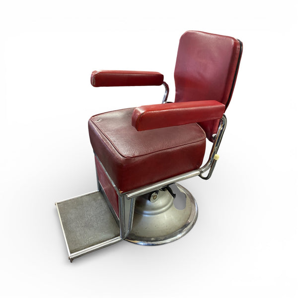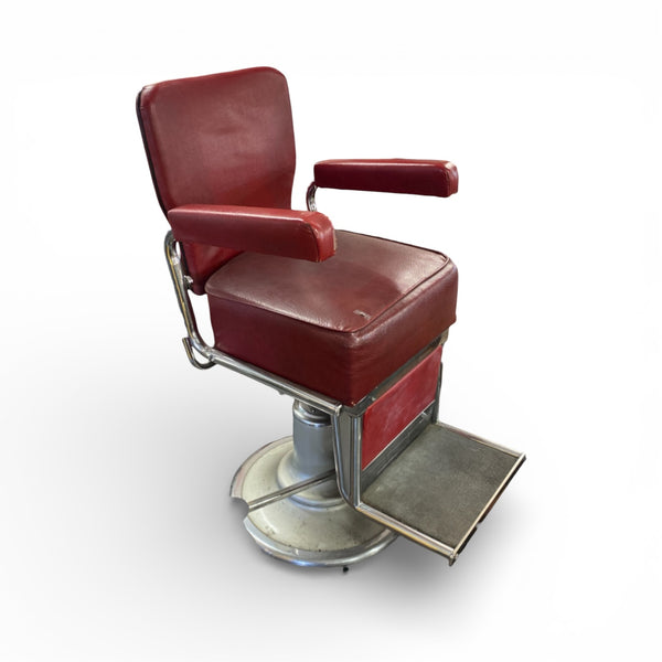 A superb vintage 1950s barbers chair. The red rexine chair is a heavy quality item that sits on a steel circular sturdy base. The barbers chair has a footrest & a foot pump action to adjust the height. The seat, backrest & arms are all in the original red rexine. The leather is in good vintage condition with a couple of slight age related signs of wear. The chair swivels.