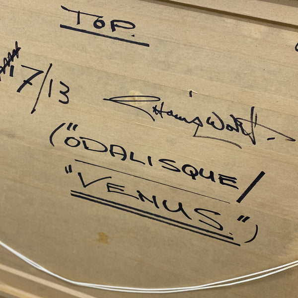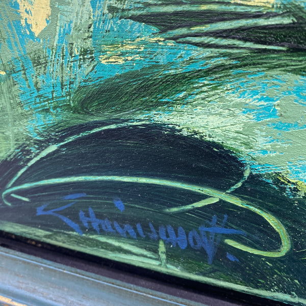 A stunning original painting by George Hainsworth, a highly accalaimed British painter & sculptor from Yorkshire, born in 1937. He studied at Leeds College of Art & the prestigious Slade School of Fine Art in London under William Coldstream. He describes his work as "figurative in the most expansive sense," exploring a wide range of subjects including landscapes, still life (especially flowers and fruit), mythology, & nudes. The professionally framed 'Venus' is a stunning painting, great composition & bold colours. The green & gold framing compliments & highlights the paintings beauty. The painting remains in fabulous condition, & is signed to the front & back.