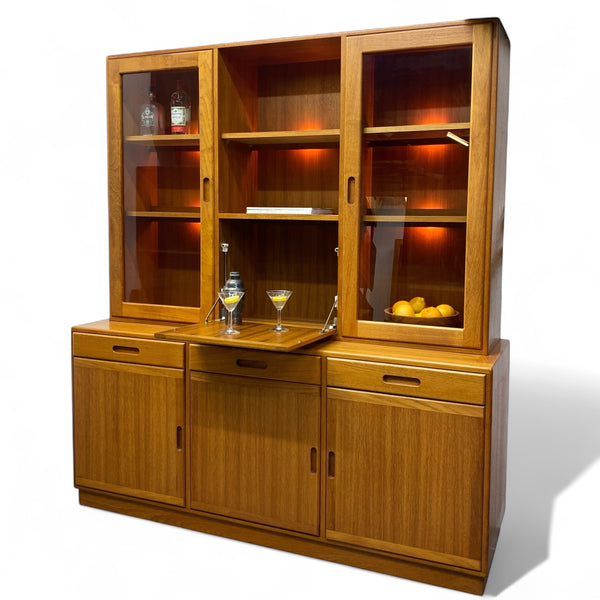 Benny Linden was known for his Scandinavian-style furniture, often made from teak wood. His creations are characterised by a simple, functional & elegant aesthetic. This wall unit in teak has an abundance of storage requirements with its front glazed cabinets with shelving, a drop down cocktail cabinet, three drawers including a cutlery divider area, & three cupboards with internal shelving. The glazed units have internal lighting in a cosy warm hue. The wall unit in in very good condition & comes in two parts for transportation.