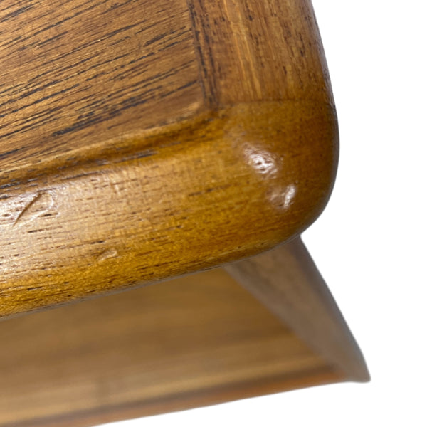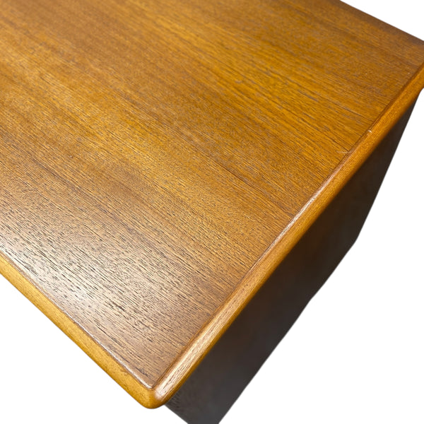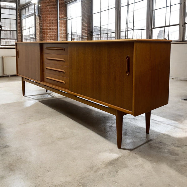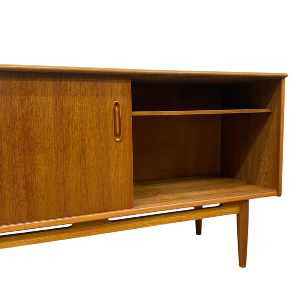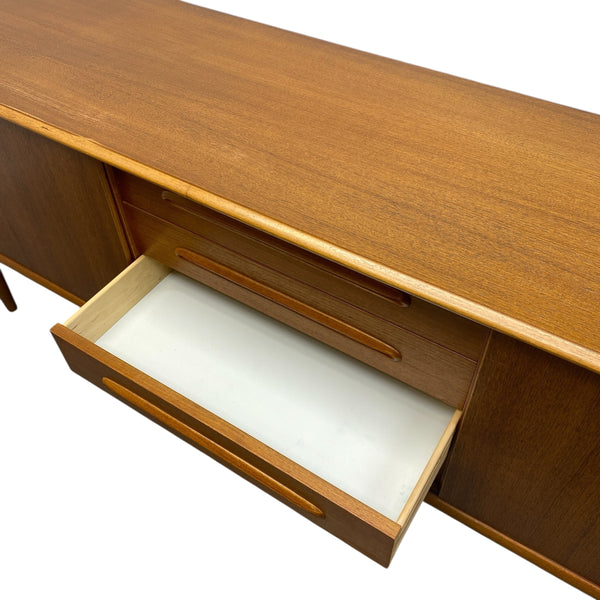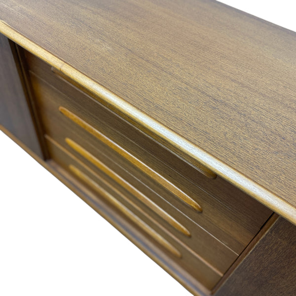 A stunning midcentury Cortina sideboard by Nils Jonsson for the Swedish manufacturer Hugo Troeds. Produced in the 1960s, this sideboard is highly valued for its clean Scandinavian design, functionality & craftsmanship. The sideboard features a long, low profile with clean lines & sculpted, recessed handles carved directly into the wood; a signature of Jonsson's designs. The design includes a central bank of four drawers, the top one lined with blue felt & a removable cutlery tray, flanked by two large cabinets with sliding doors & adjustable shelves. A fabulous piece of high end 60s furniture & in great condition.