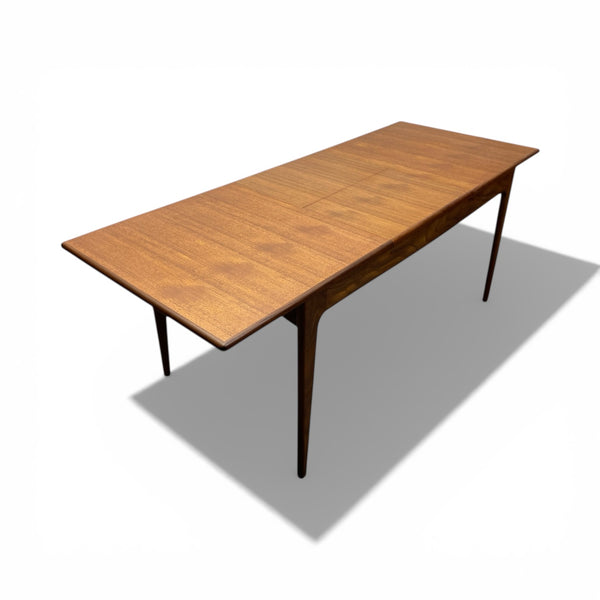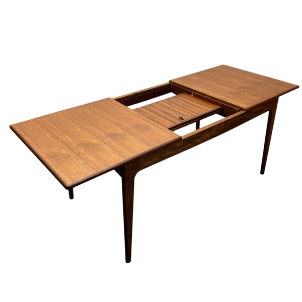 A fabulous midcentury Danish dining table designed by Henning Kjaernulf & manufactured by Sorø Stolefabrik, a classic example of Scandinavian design, produced in the 1960s. The teak dining table features clean lines, tapered legs & minimalist aesthetics. It is extendable, featuring a clever up & over simple mechanism. A stunning design, classy & quality. The dining table is in stunning condition. See our midcentury dining chairs to compliment the look.