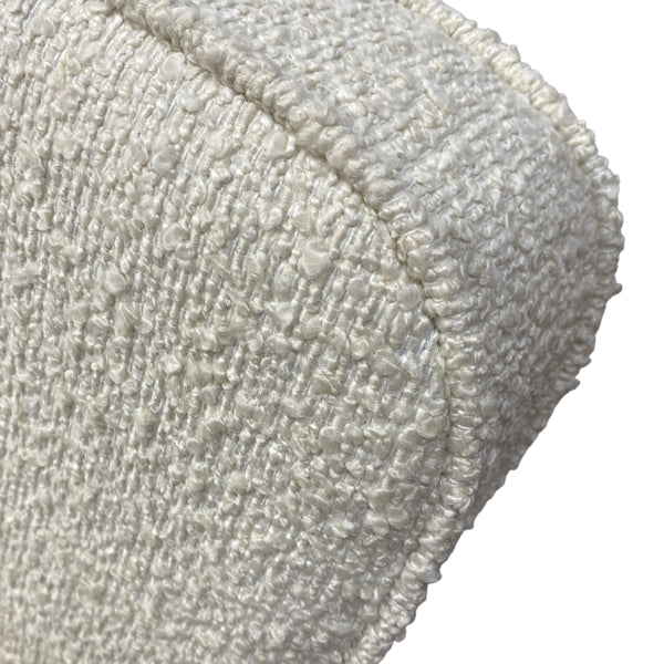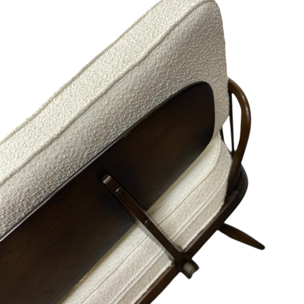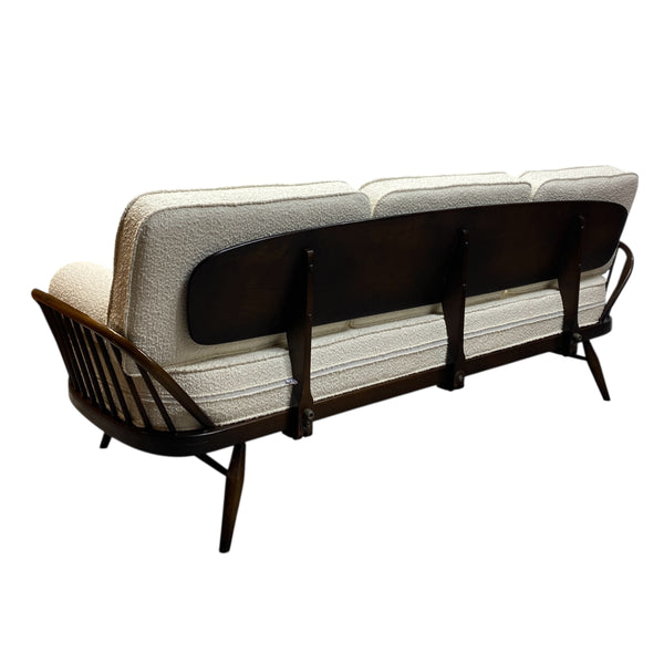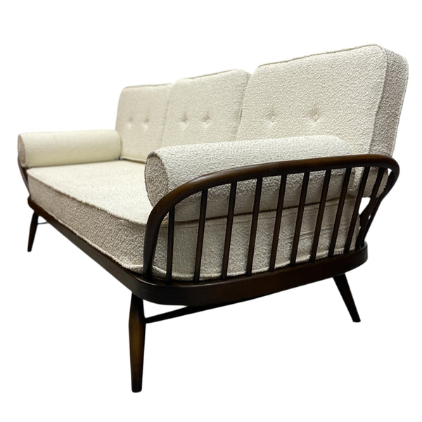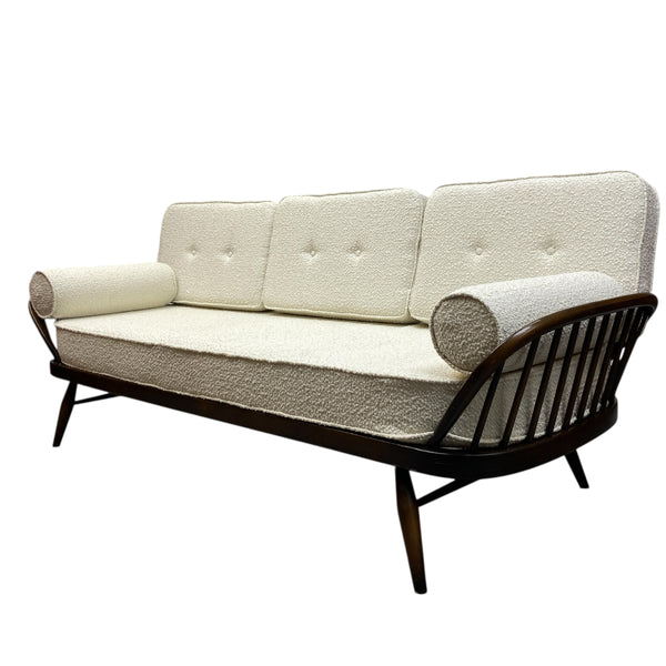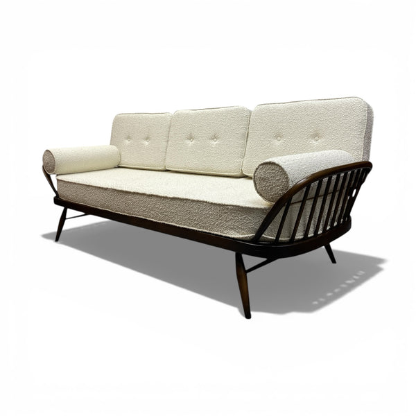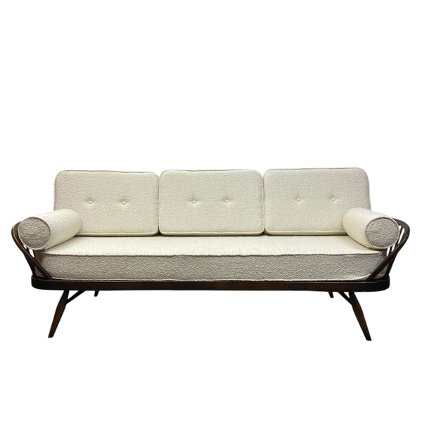 A stunning Ercol 355 Studio Couch, a classic mid-century modern design that functions as both a three seater sofa & a daybed. The Ercol daybed has a solid ash & beech frame, features a steam-bent backrest & tapered legs. The seat, back & bolster cushions are all professionally upholstered in a white boucle quality fabric. The webbing is all in good order. A fabulous piece for any interior style or room & very comfortable.