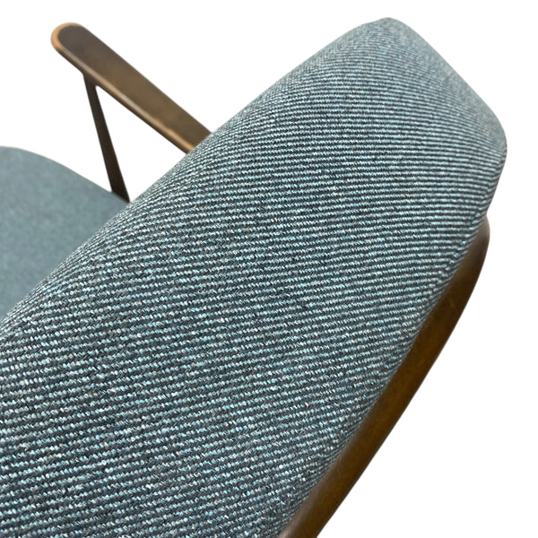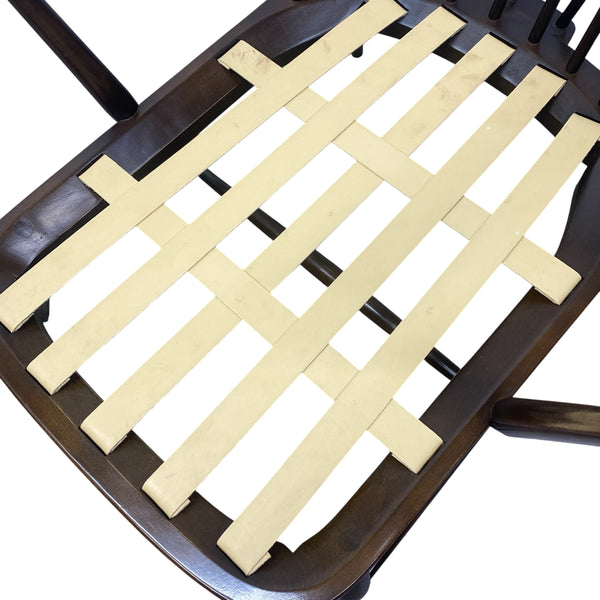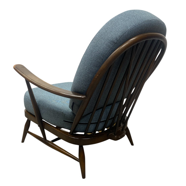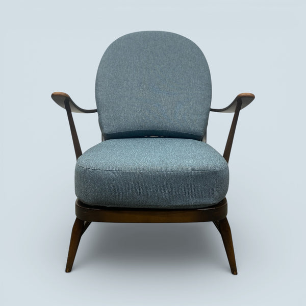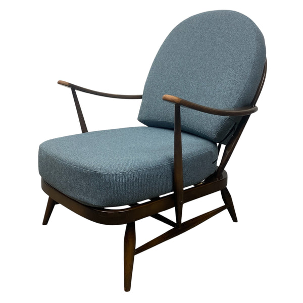 A midcentury Ercol easy chair model 203. This iconic piece is part of the Ercol Windsor collection, first launched in 1946 by Lucian Ercolani, the company's founder. It features a distinctive rounded spindle-back, elegantly curved armrests & splayed turned legs connected by stretchers. The frame is made of solid beech & elm in a dark stain. The Ercol 203 armchair is a sought-after mid-century design classic. The seat & back cushions are newly upholstered & the Pirelli webbing has been replaced.