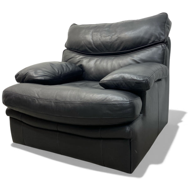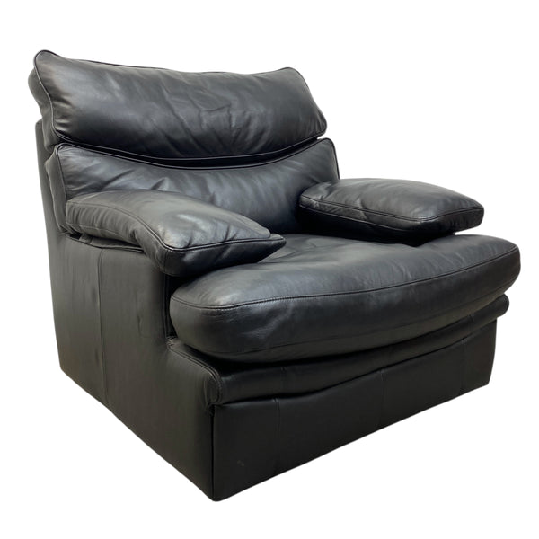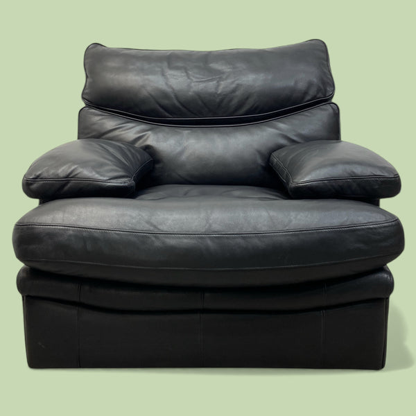 Manufactured for the Seattle range, this G Plan lounge chair showcases exceptional black leather upholstery. The supple hide delivers genuine comfort while the design focuses on proportions & quality reflecting on G Plan's history as a furniture maker. The lounge chair has a fairly big footprint, but definitely oozes comfort. The chair is in super condition.