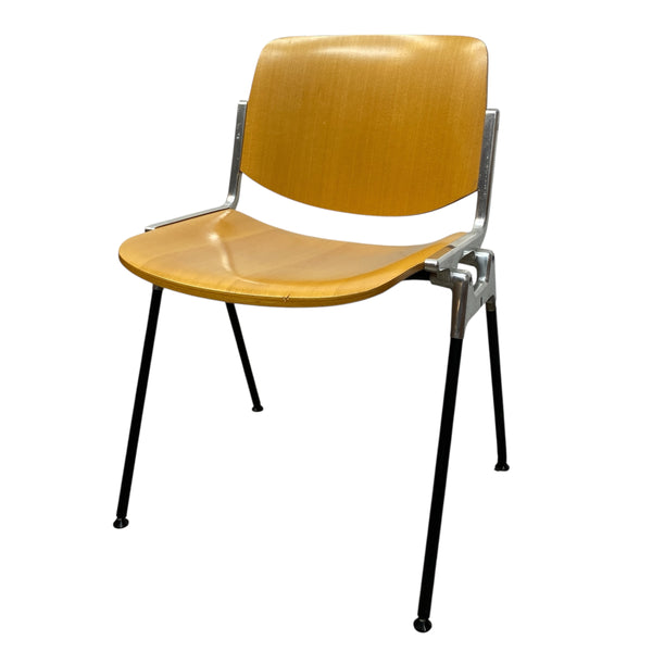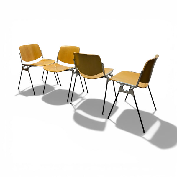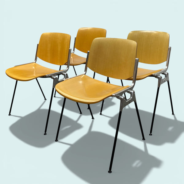 A set of four midcentury DSC 106 Giancarlo Piretti dining chairs. The Italian chairs are manufactured by Anonima Castelli. The four chairs feature a signature cast aluminum frame & curved beech plywood seats & backrests. The chairs are in good vintage condition, are quality designed & manufactured & look super stylish. See listing for sets of two & six. STACKABLE.