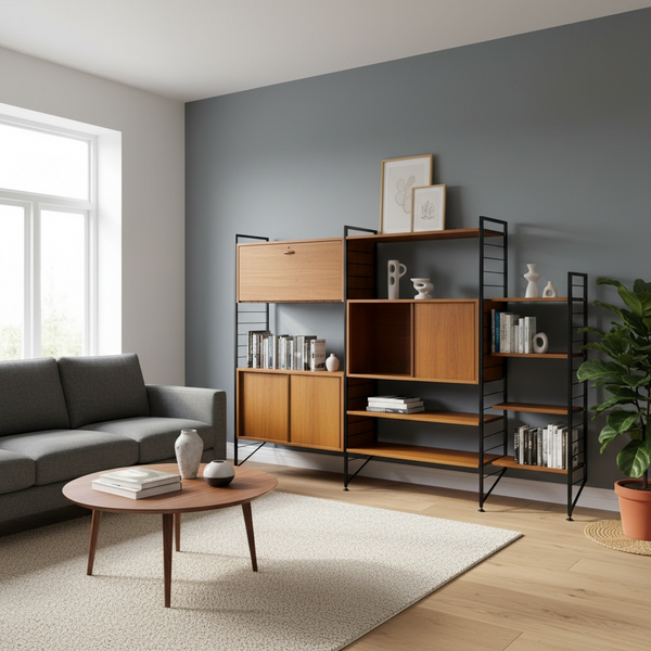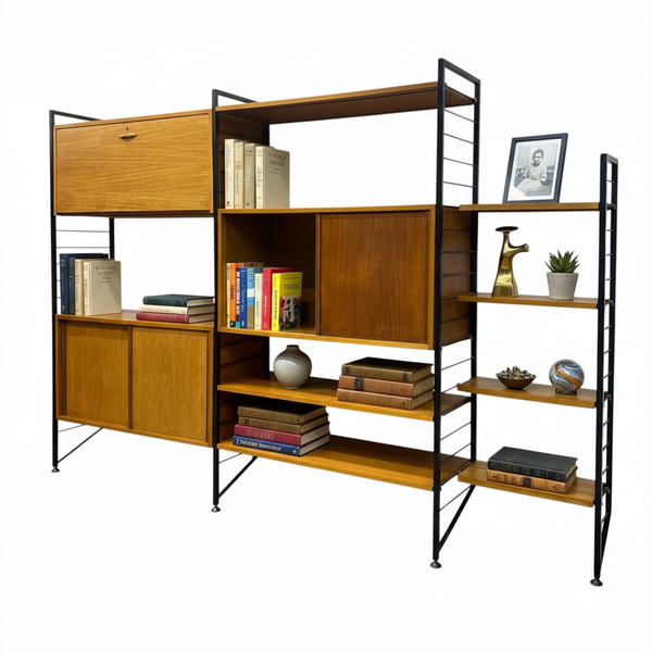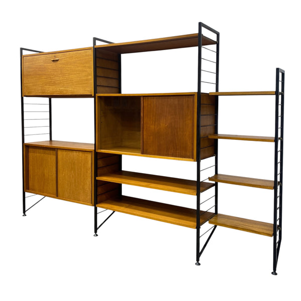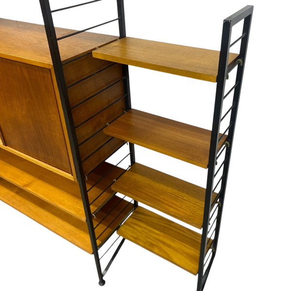 A fabulous midcentury Ladderax system circa 1960s. The Ladderax modular shelving system, a hallmark of British Mid-Century Modern design was designed in 1964 by Robert Heal & manufactured by Staples of Cricklewood, London. The system is celebrated for its versatility & minimalist aesthetic influenced by the Danish school of design. The three bay system consists of four black steel upright ladders supporting seven shelves, a bureau & two double cupboards. The teak is in good condition & is a rich brown colour. The ladderax is self supporting & stands freely against a wall.