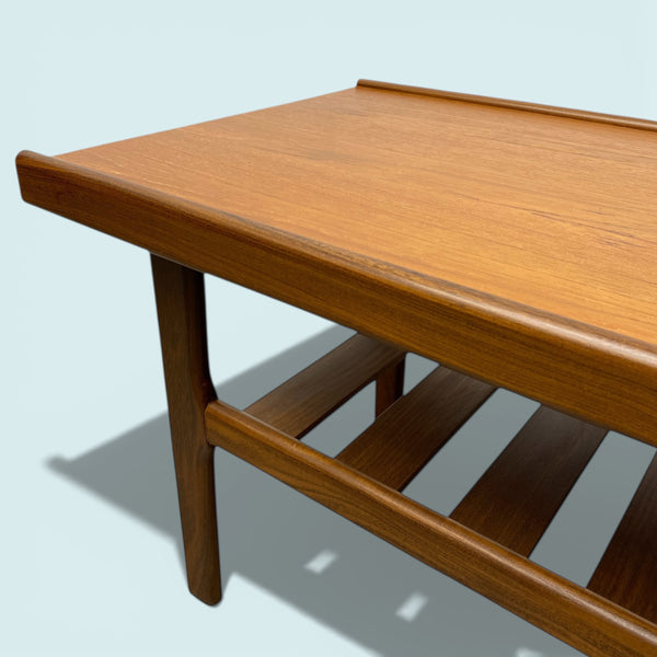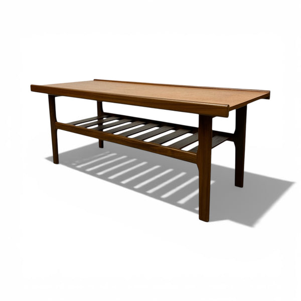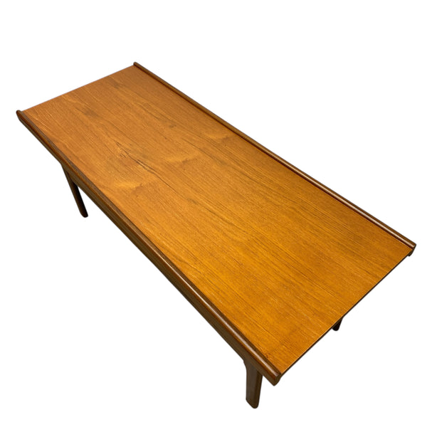 A midcentury British Myers coffee table in teak with afromosia edging, legs & shelf. The Danish style coffee table is a great shape & size with a slatted magazine rack underneath for books & magazines. The coffee table is in good vintage condition.