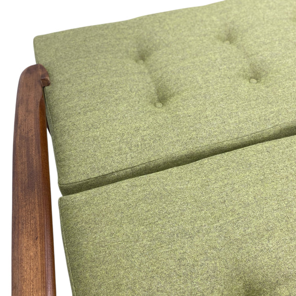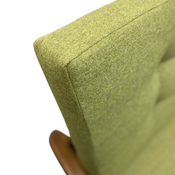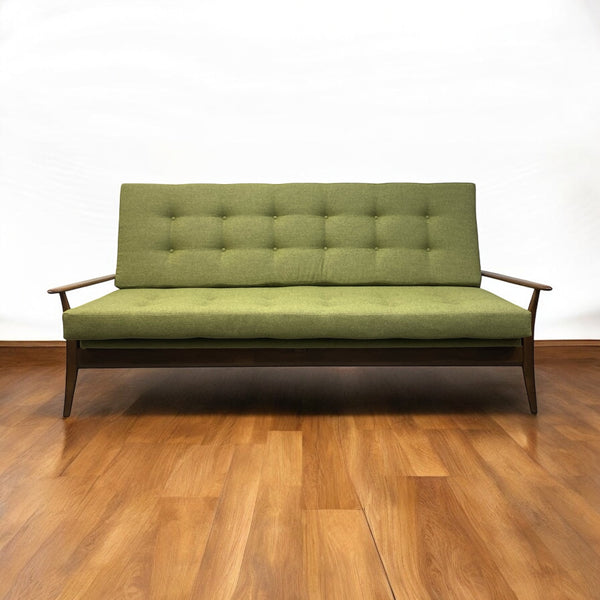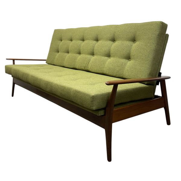 A beautiful midcentury sofa bed. The three seater sofa has a teak frame, legs & arms, all of which are very elegant, angled & tapered. The sofa bed seat & backrest have been professionally refurbished in a stunning green wool quality fabric from Yorkshire Camira with button detailing to both. The sofa is transformed into a double sofa bed with an easy push & pull action suitable for guests. The piece is a great shape & contemporary colour.