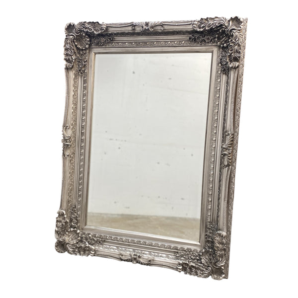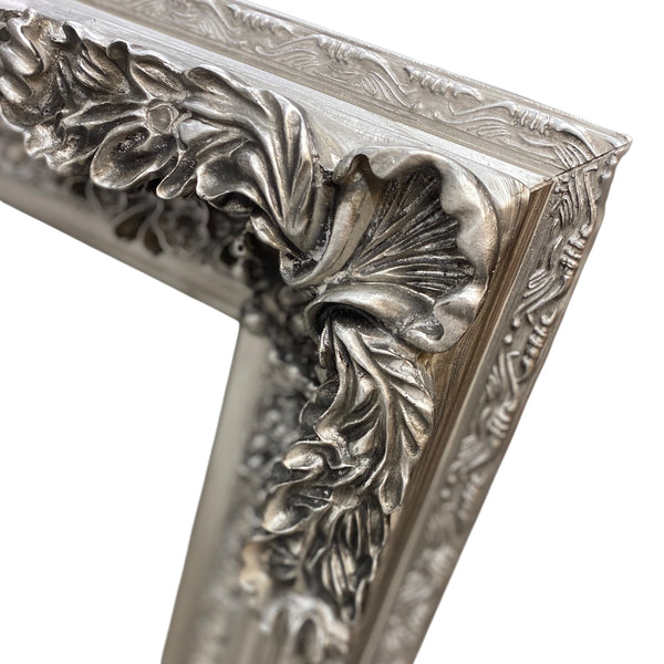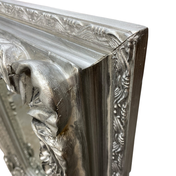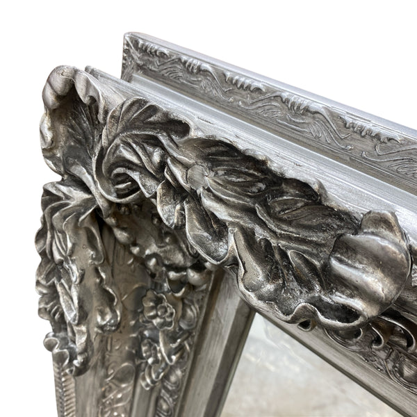 A large ornate mirror in a silver paint effect. The floor standing or wall hung mirror is a super decorative piece to compliment an interior style, whether midcentury or period. The mirror itself is quality & in good condition. The decorative frame is deep, ornate & in very good condition.