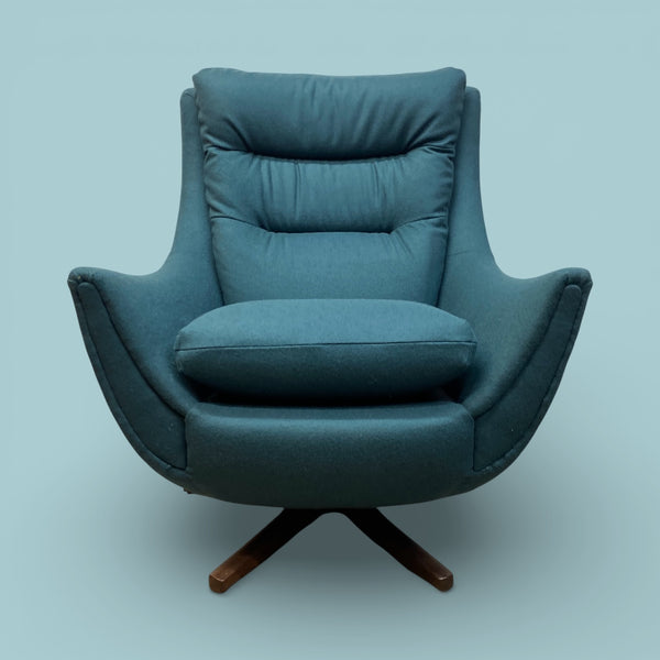 A stunning reupholstered 1960s Parker Knoll 'egg' or Ambassador chair. This beautifully shaped curved chair is the epitome of comfort with its tilt & swivel action. The chair sits on a teak base & the teal Camira wool fabric brings it into modern day living. A beautiful edition to any interior style.