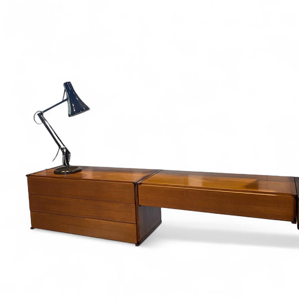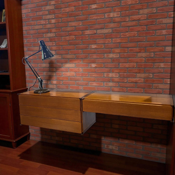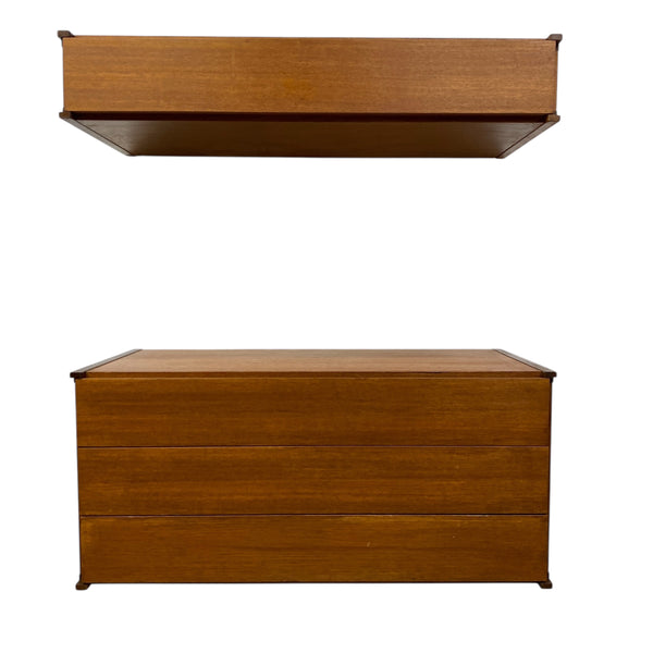 This vintage wall mounted modular storage system dates back to the 1960s & is crafted in richly grained teak veneer. It features a desk with a drawer & a set of three separate drawers. The original Beaver & Tapley brackets with internal spirit levels are included. See our listings for other wall mounted storage. The pieces are modular so can be wall mounted to suit any design or preference.